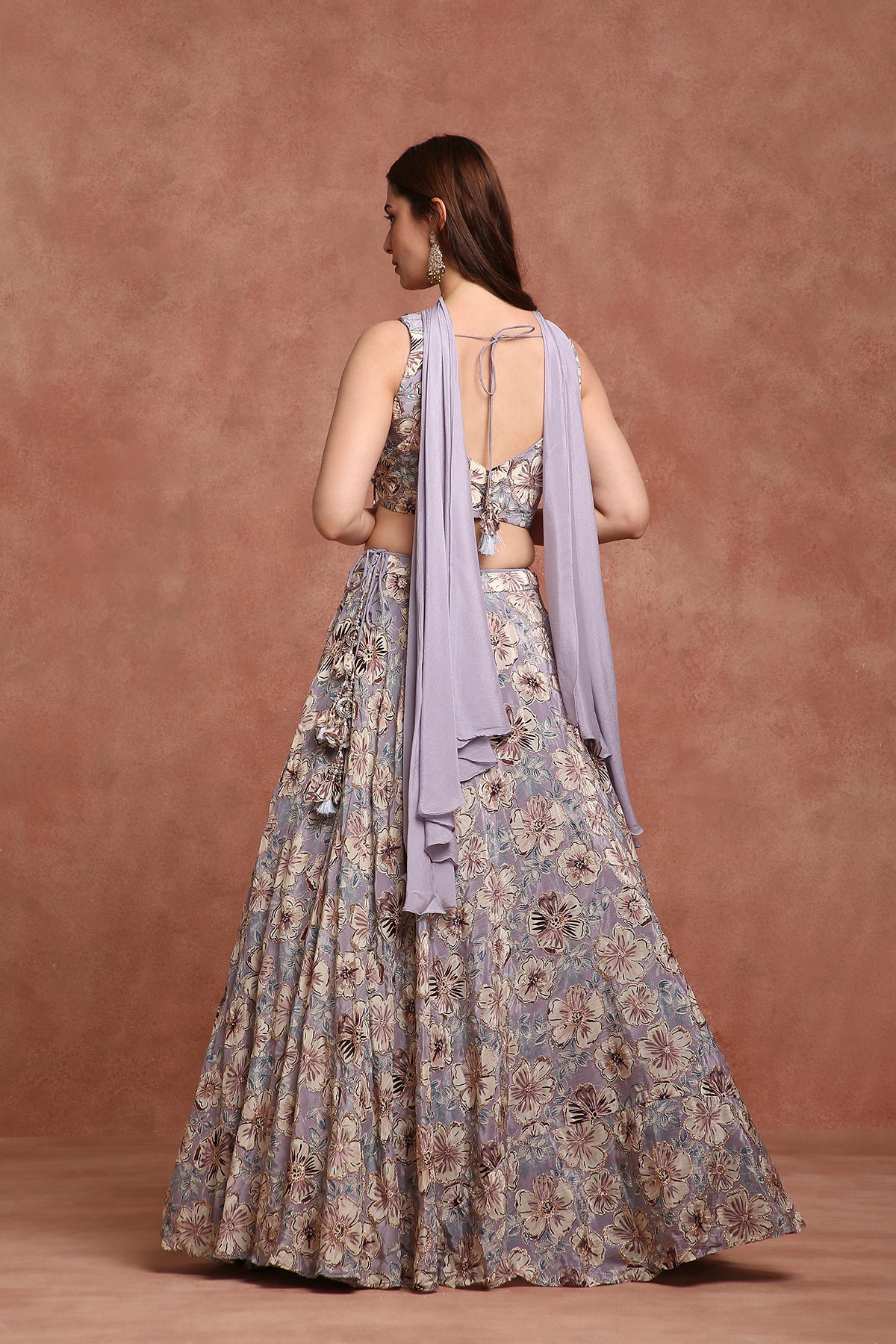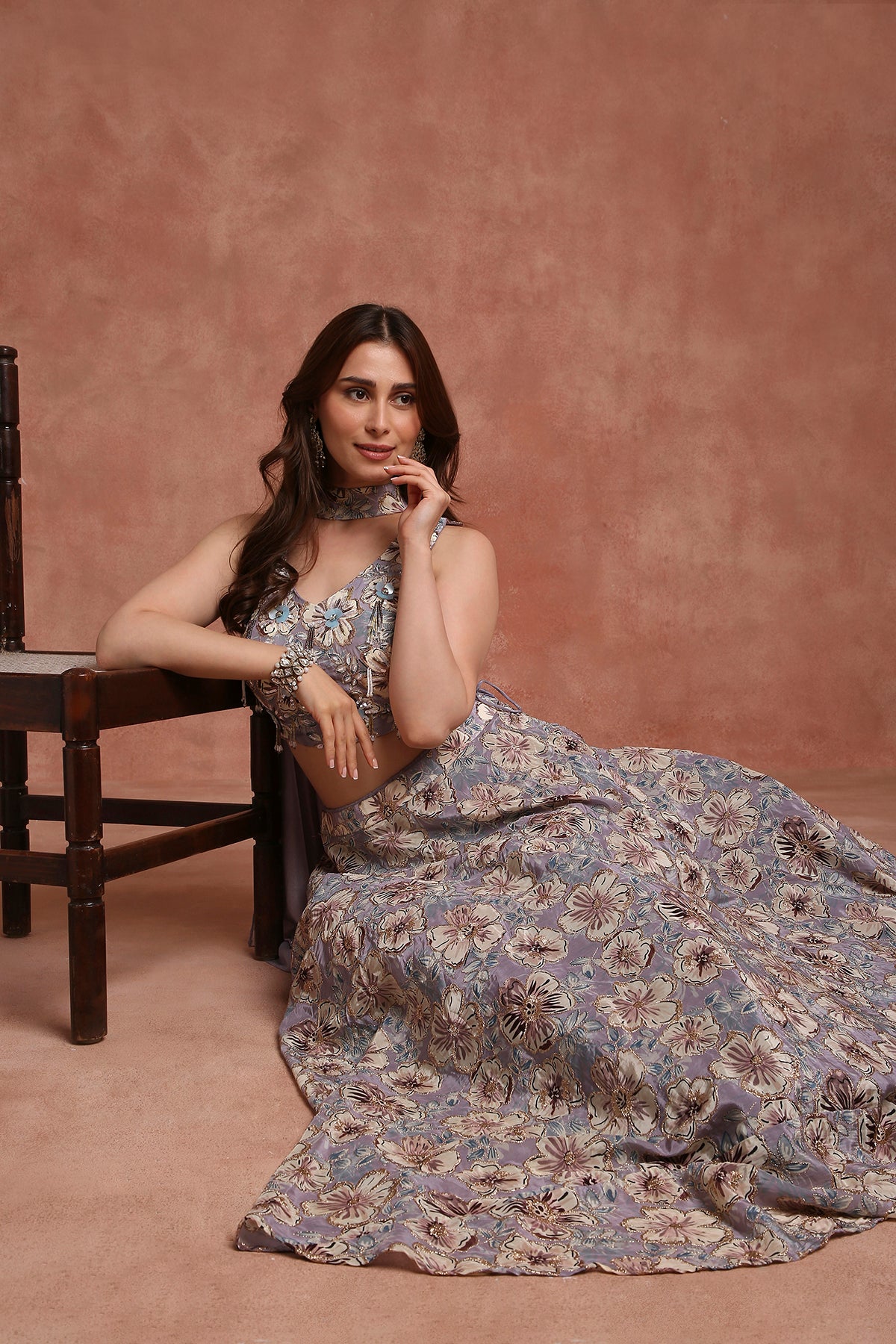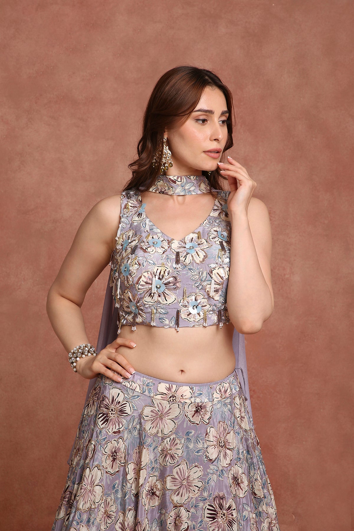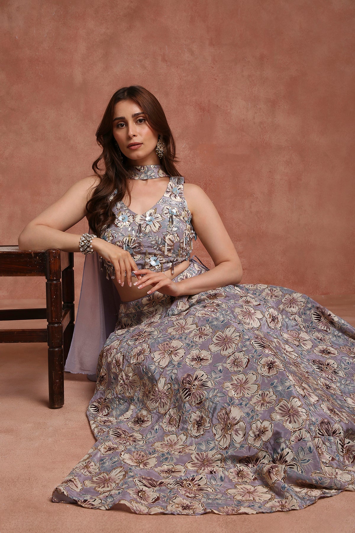 Turn heads in this exquisitely embroidered lilac-grey lehenga set, a graceful blend of floral elegance and contemporary charm. Designed for those who love refined glamour, this two-piece ensemble features a sleeveless embellished blouse and a flared lehenga skirt, making it a perfect pick for sangeets, cocktail events, wedding receptions, or festive soirées.