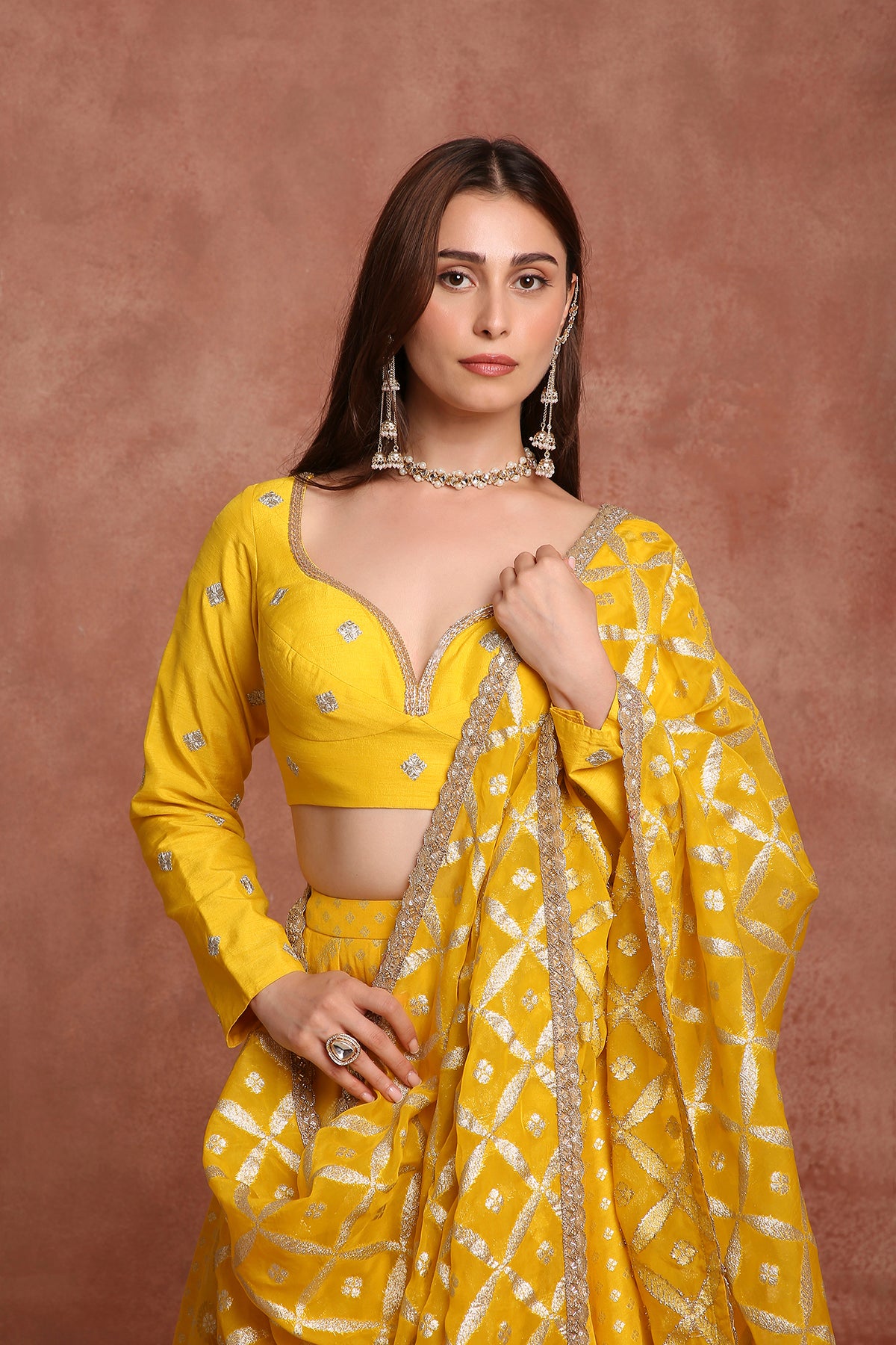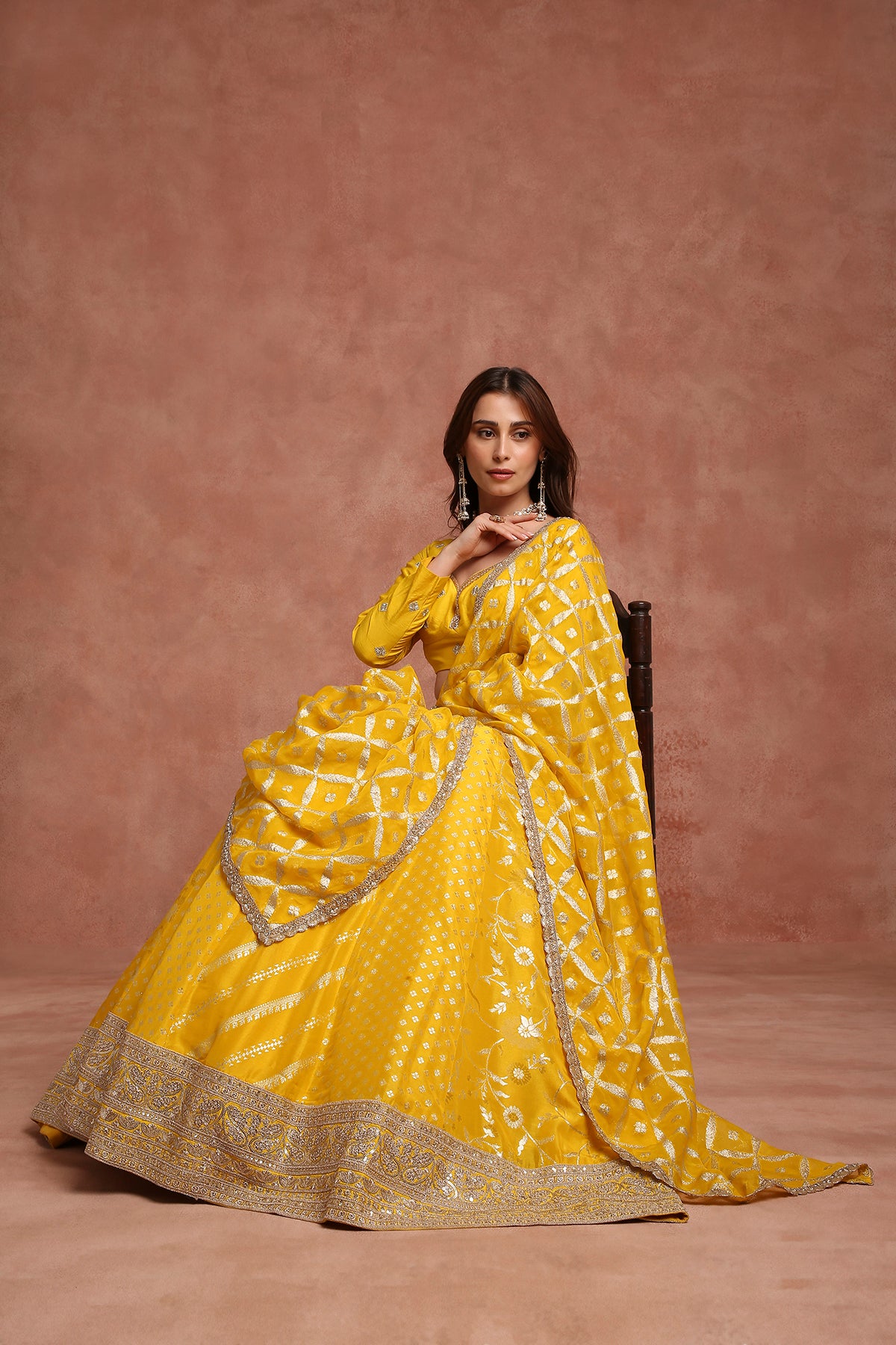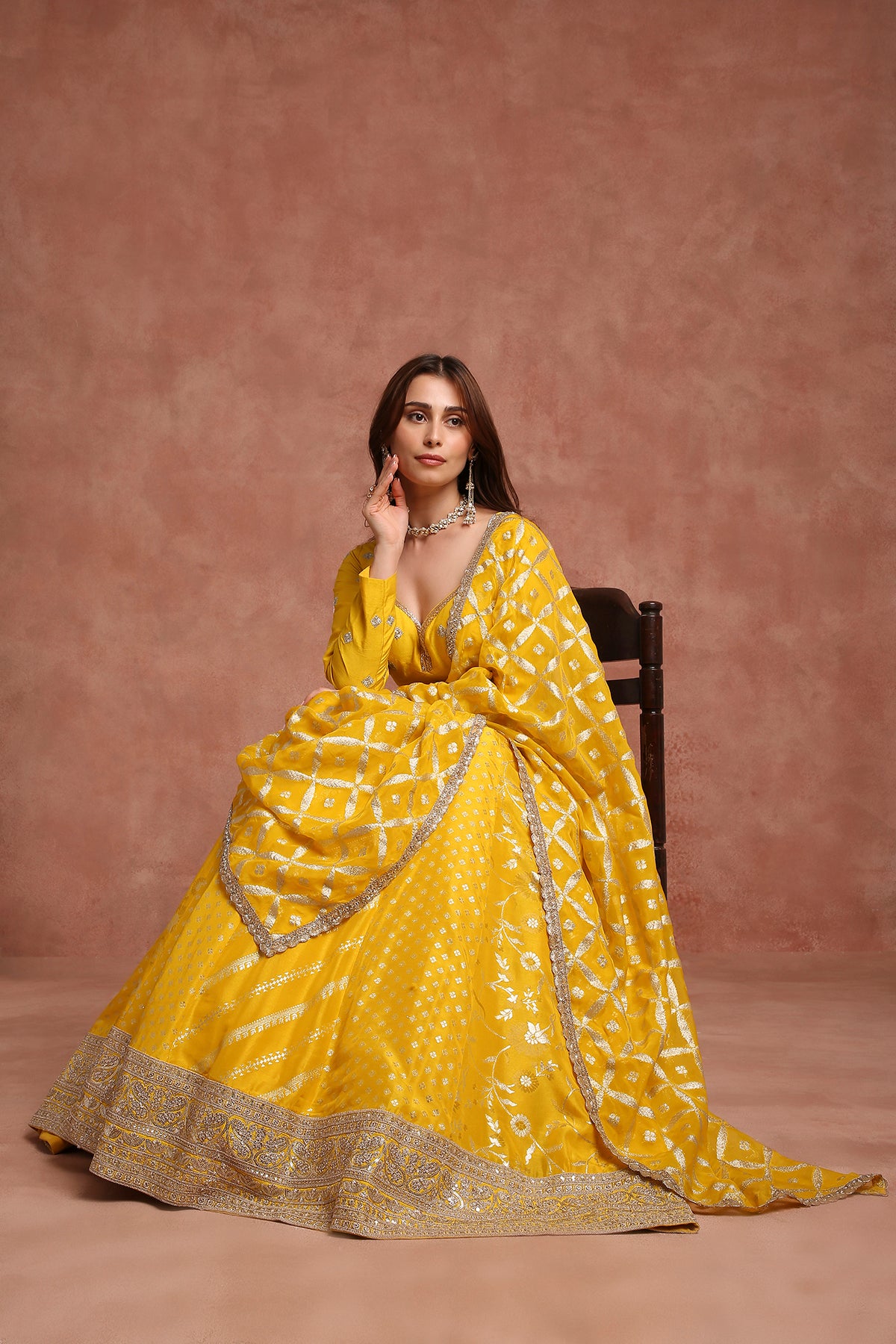 Bring sunshine and celebration to life with this radiant mustard yellow lehenga choli set. This vibrant outfit is designed for haldi ceremonies, daytime weddings, and joyful festive occasions—where brightness, tradition, and style converge.