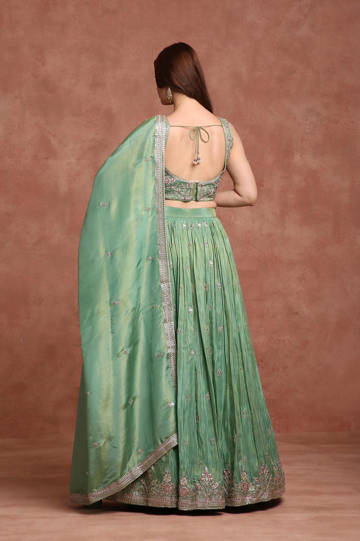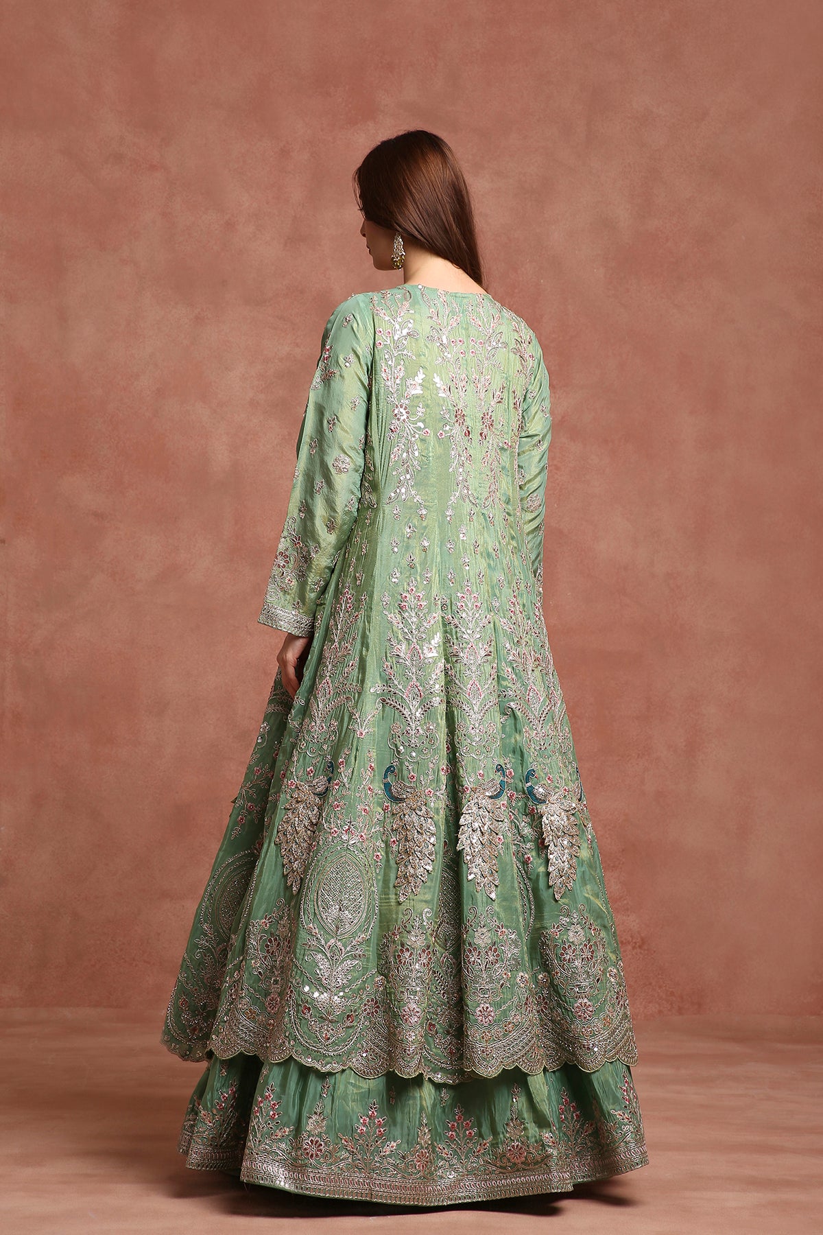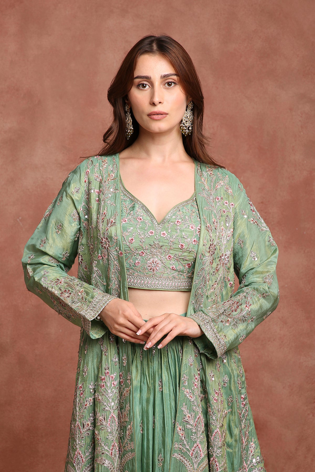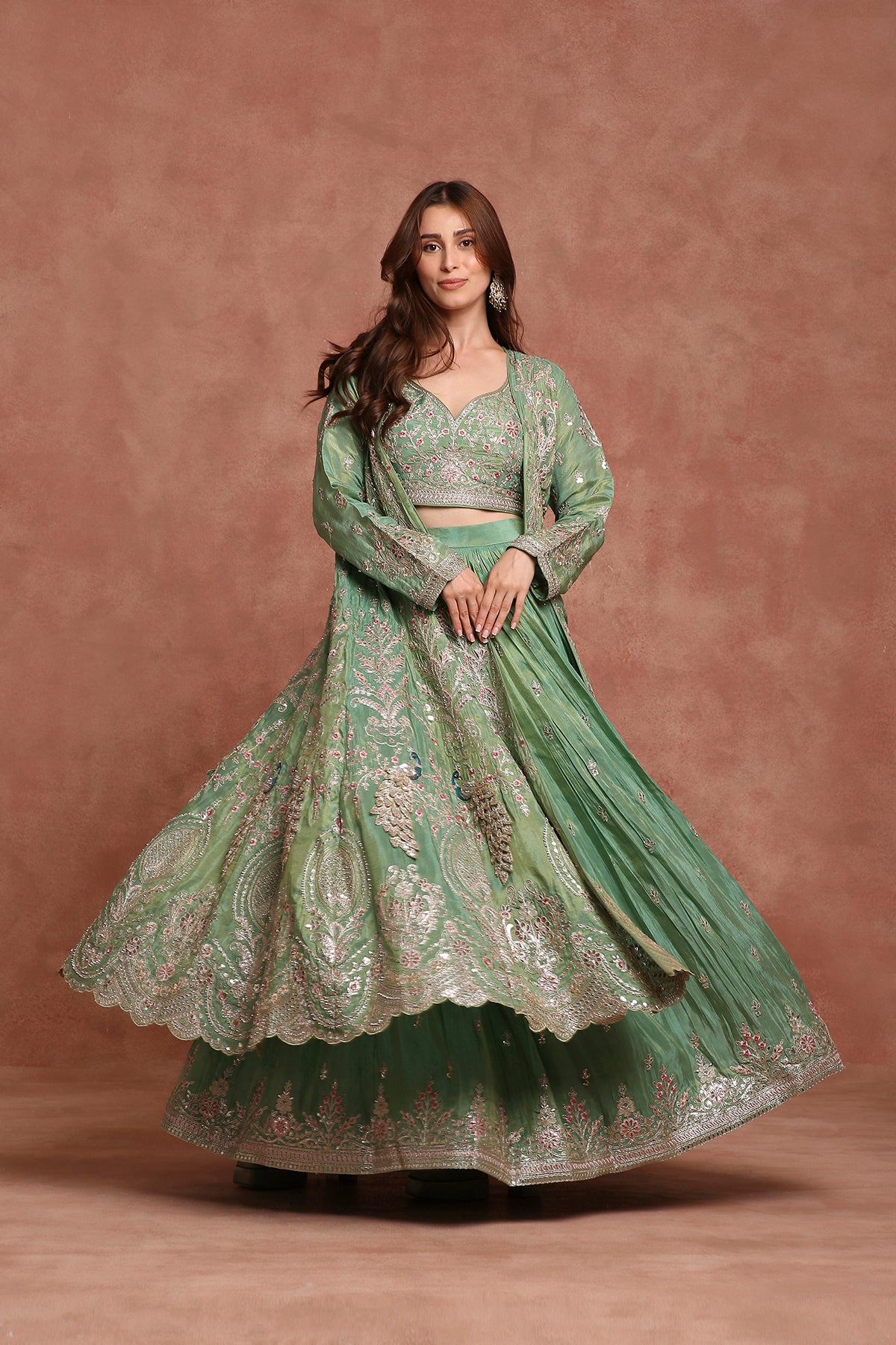 Step into the spotlight in this uniquely regal Mint Green Embroidered Jacket Lehenga, a perfect blend of traditional charm and modern sophistication. Crafted in a refreshing shade of pastel mint, this ensemble stands out with its full-length, front-open jacket silhouette layered over a matching lehenga and blouse.