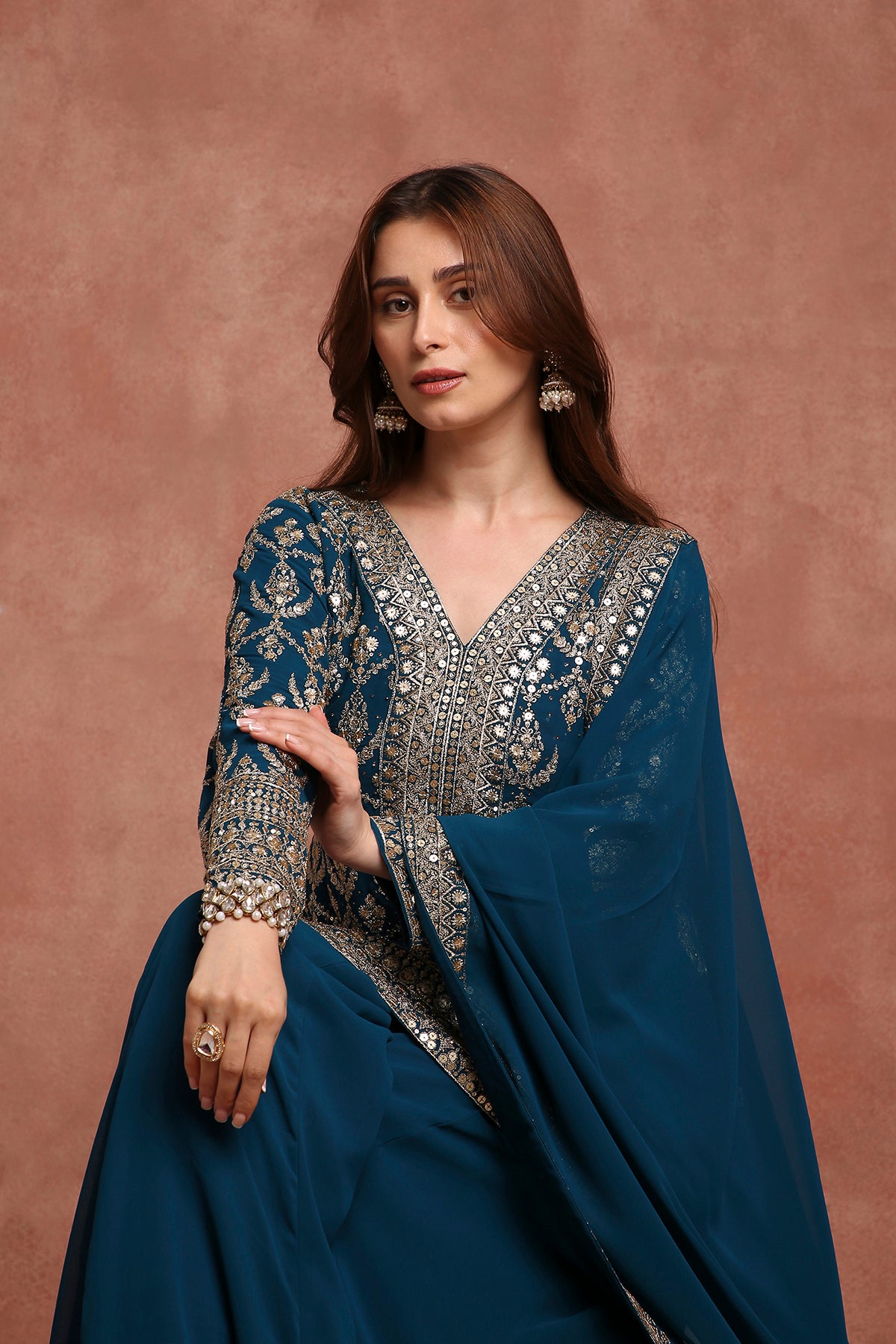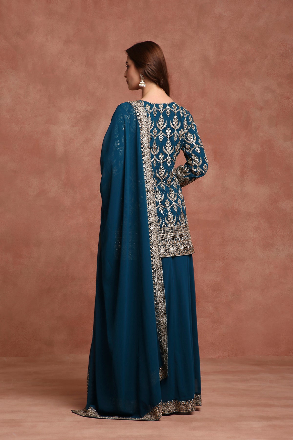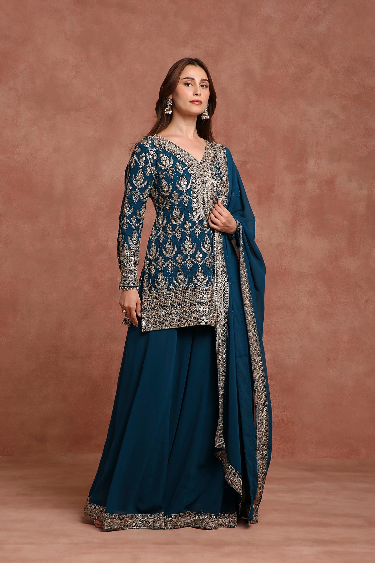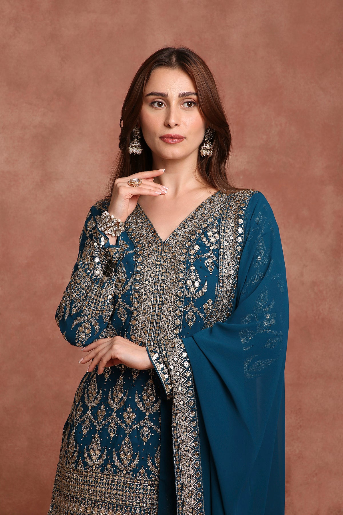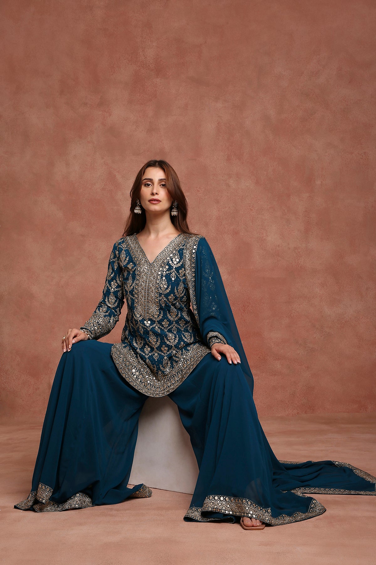 Channel timeless elegance with this breathtaking teal blue sharara suit set, a perfect fusion of royal tradition and contemporary allure. Crafted for grand occasions such as weddings, festive celebrations, or evening soirees, this outfit showcases refined embroidery and a regal silhouette that exudes class and sophistication.