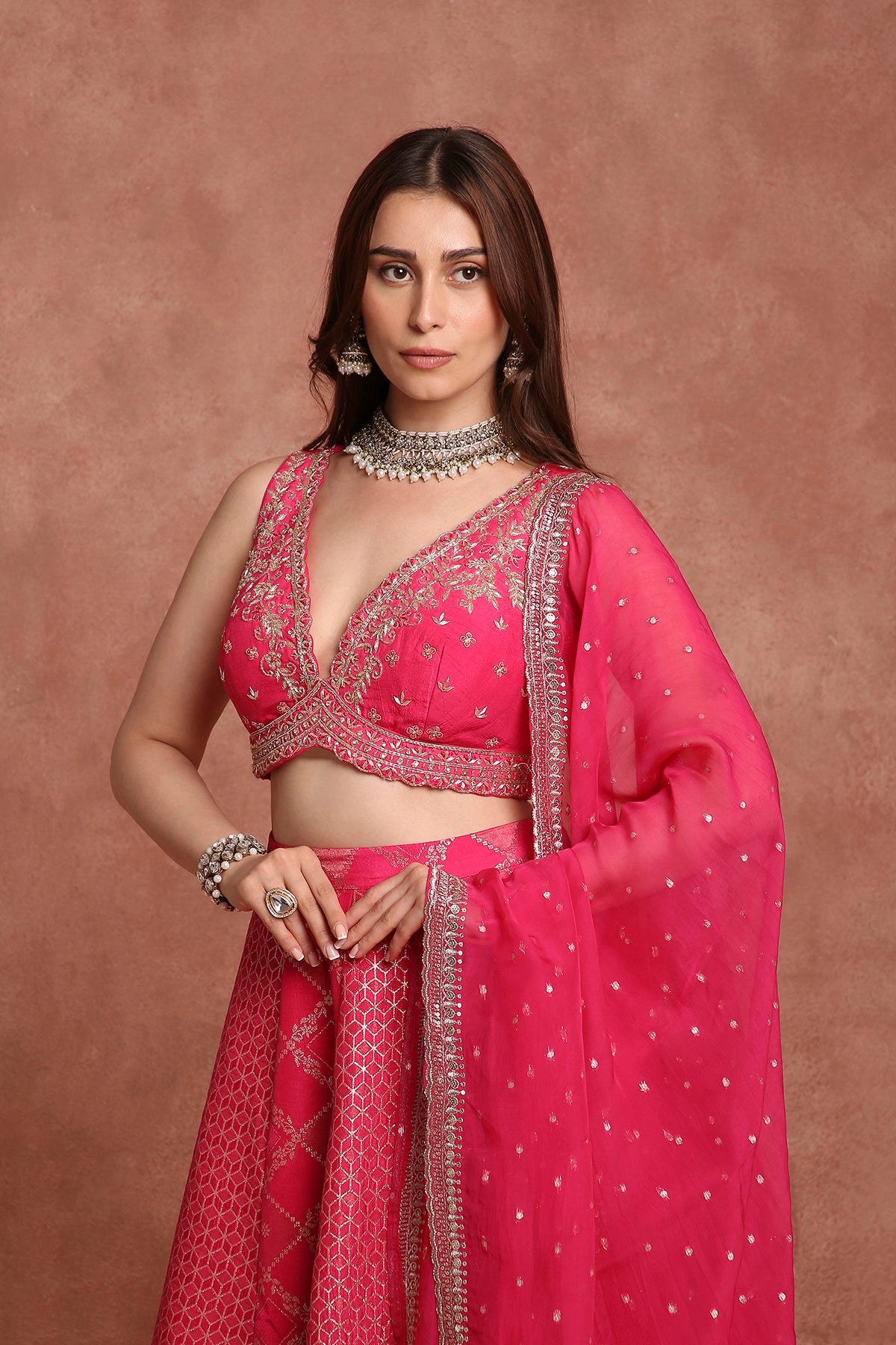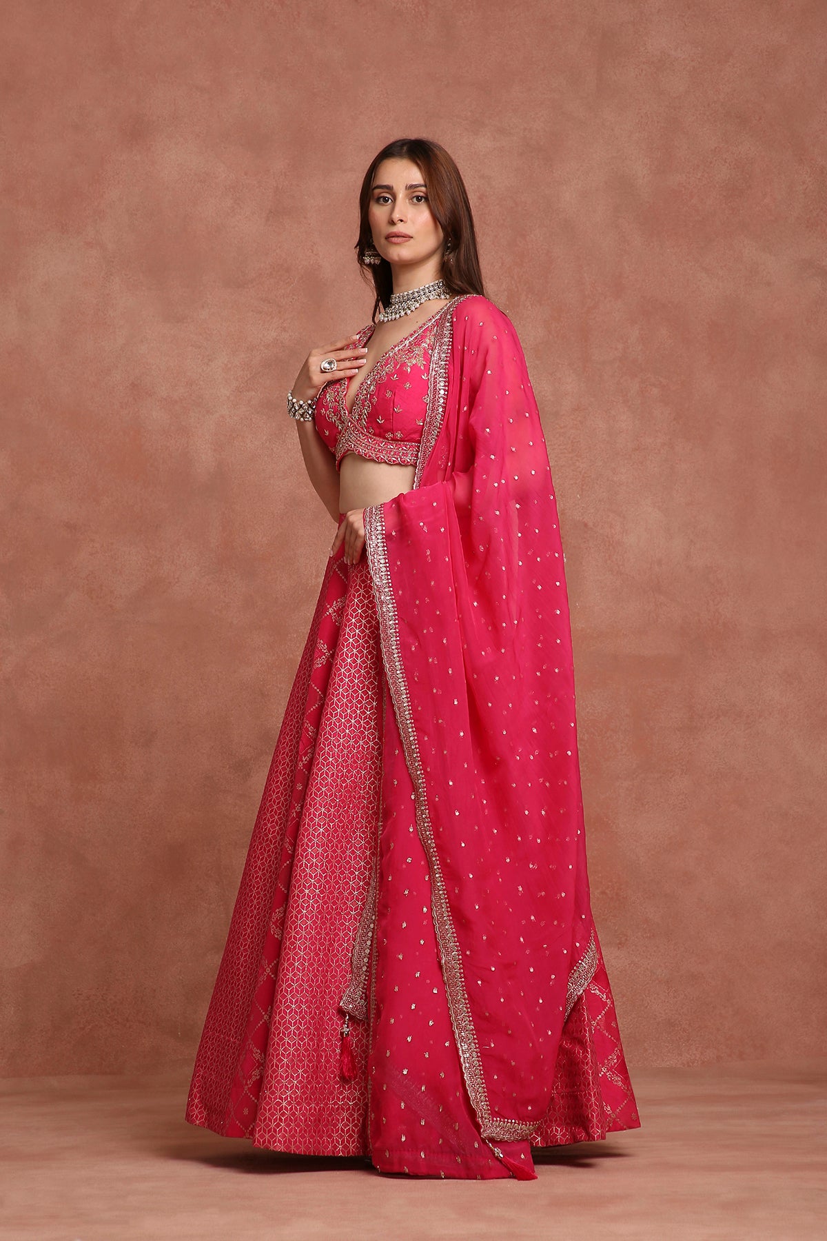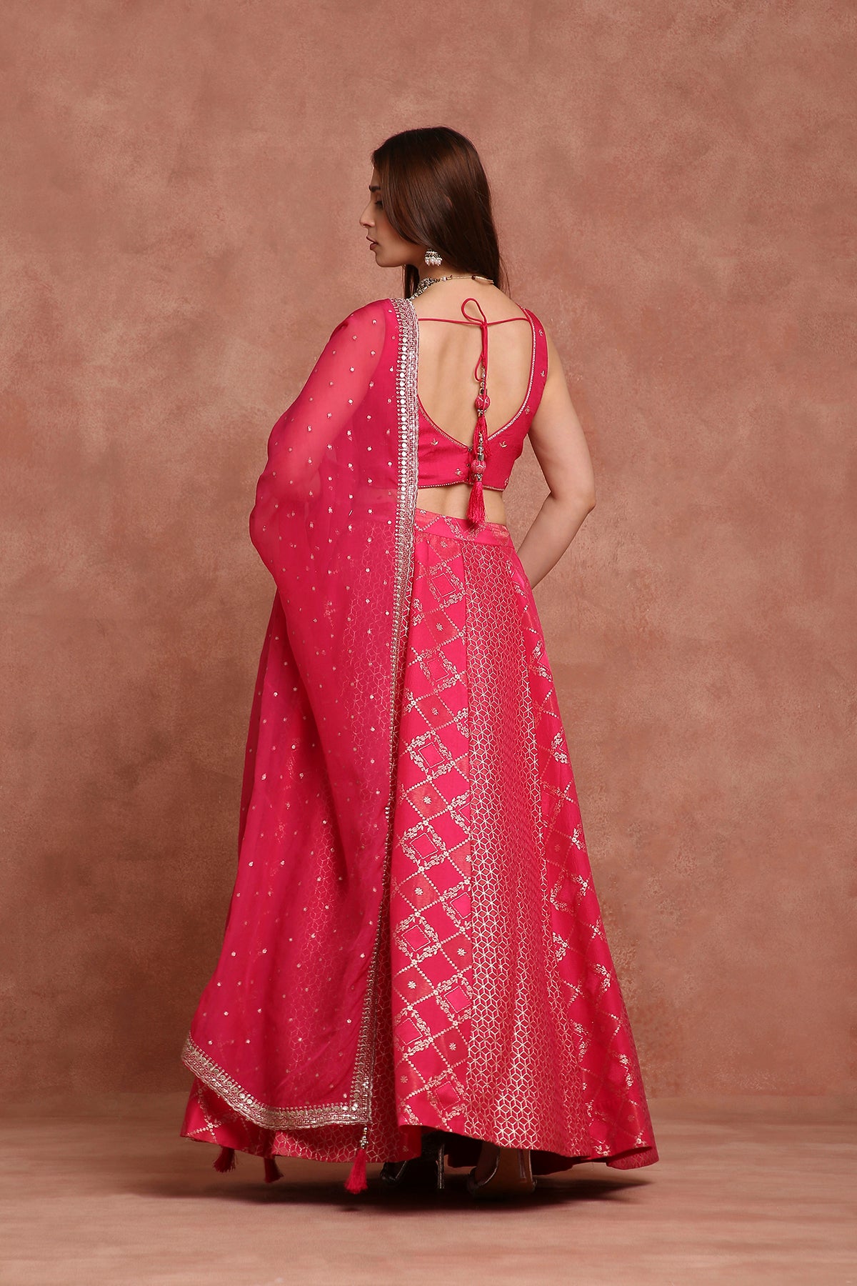 Turn heads with the vibrancy of tradition and the grace of contemporary design in this Rani Pink Banarasi Silk Lehenga Set. Crafted using rich Banarasi silk fabric, this ensemble features intricate woven patterns in zari that speak of centuries-old textile artistry. The lehenga is a celebration of color, culture, and craftsmanship, designed for the woman who wants to make a statement with subtlety.