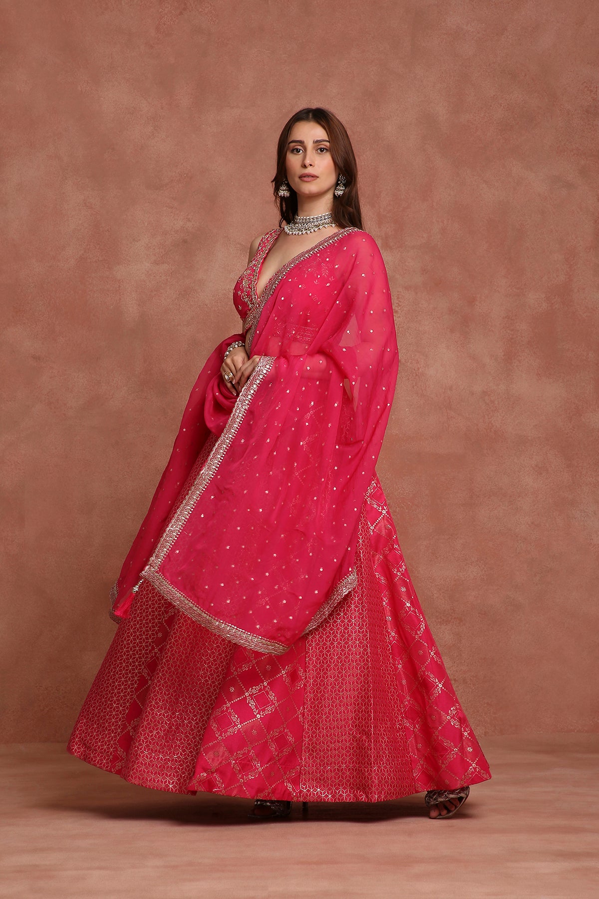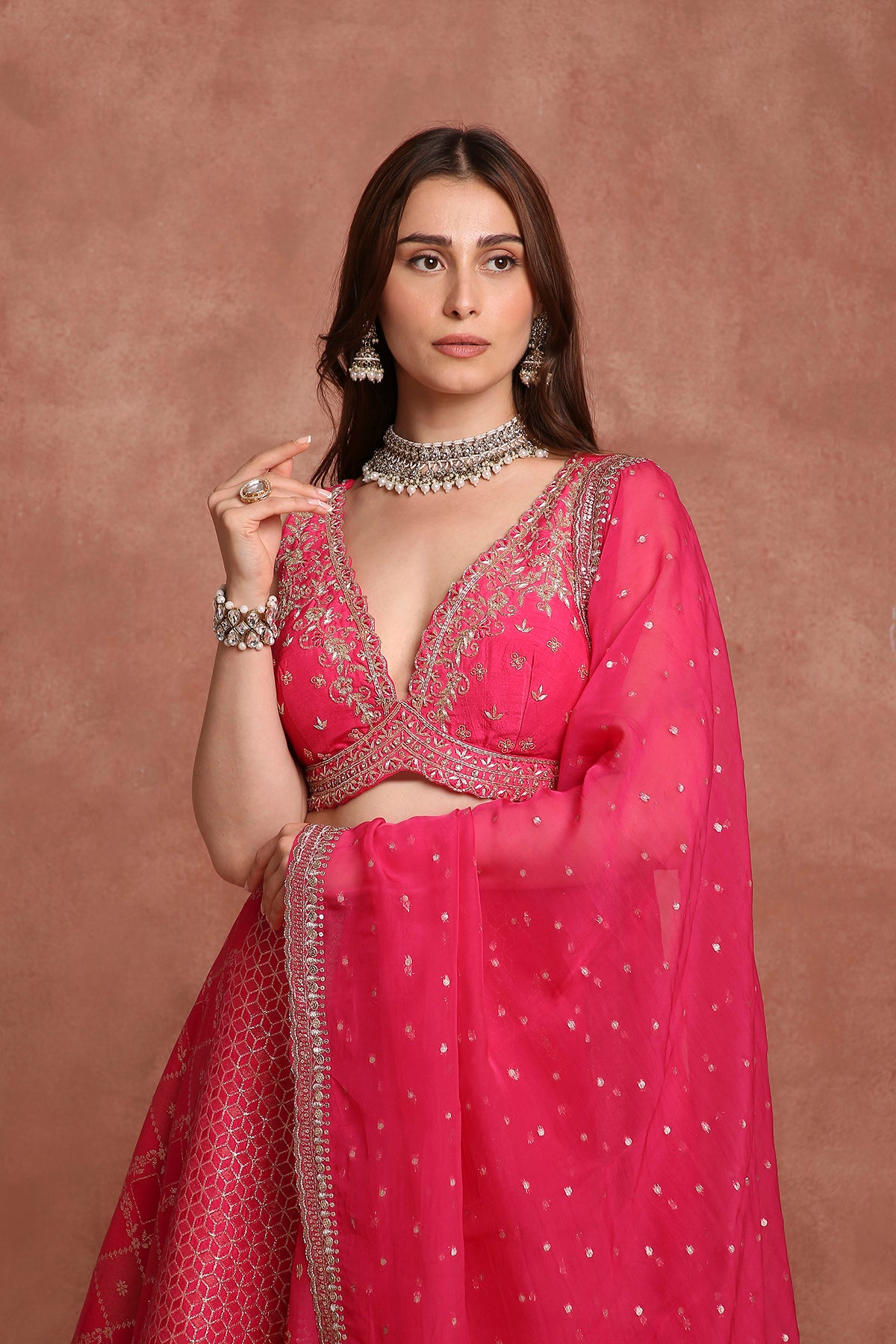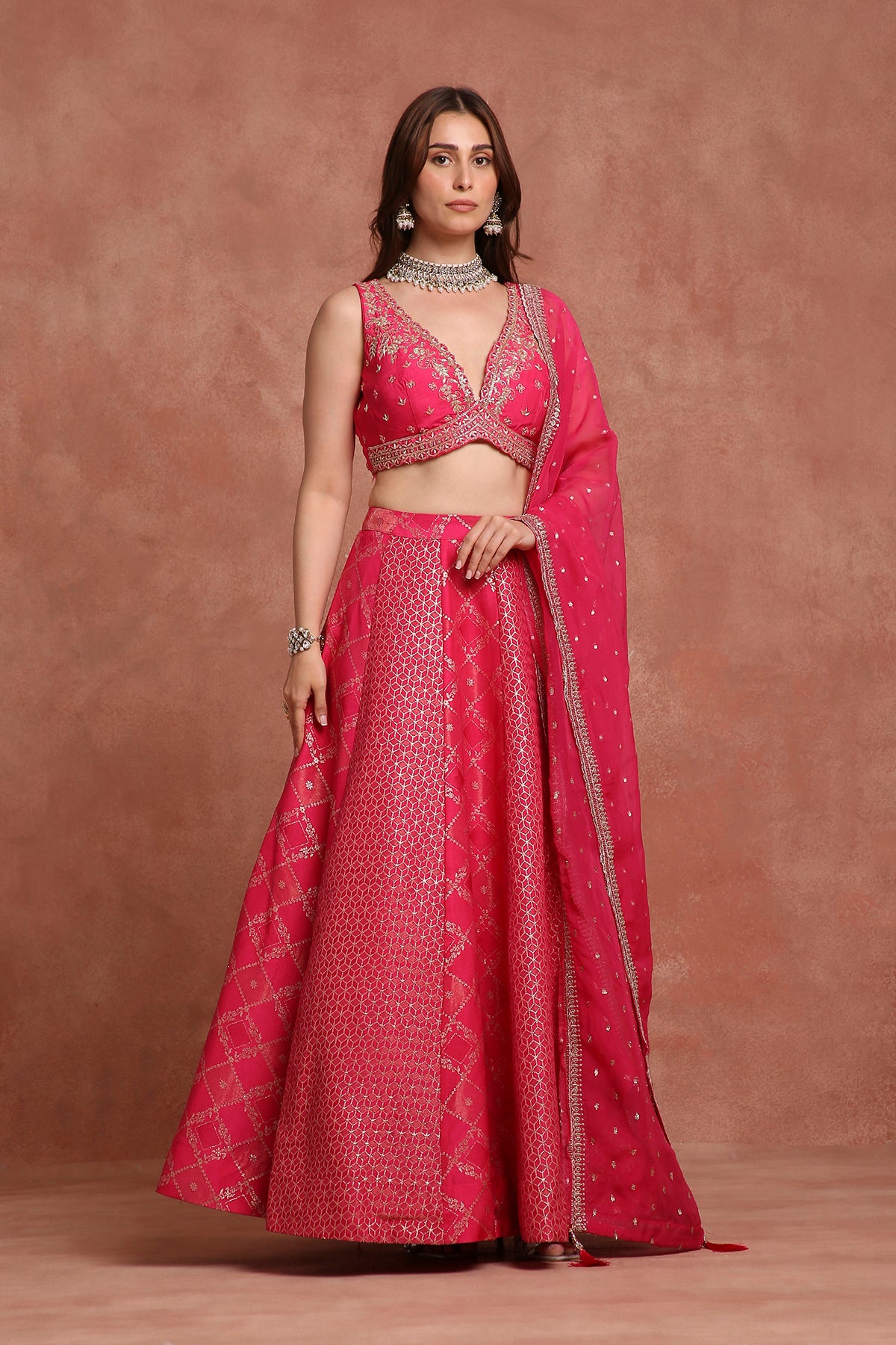 Turn heads with the vibrancy of tradition and the grace of contemporary design in this Rani Pink Banarasi Silk Lehenga Set. Crafted using rich Banarasi silk fabric, this ensemble features intricate woven patterns in zari that speak of centuries-old textile artistry. The lehenga is a celebration of color, culture, and craftsmanship, designed for the woman who wants to make a statement with subtlety.