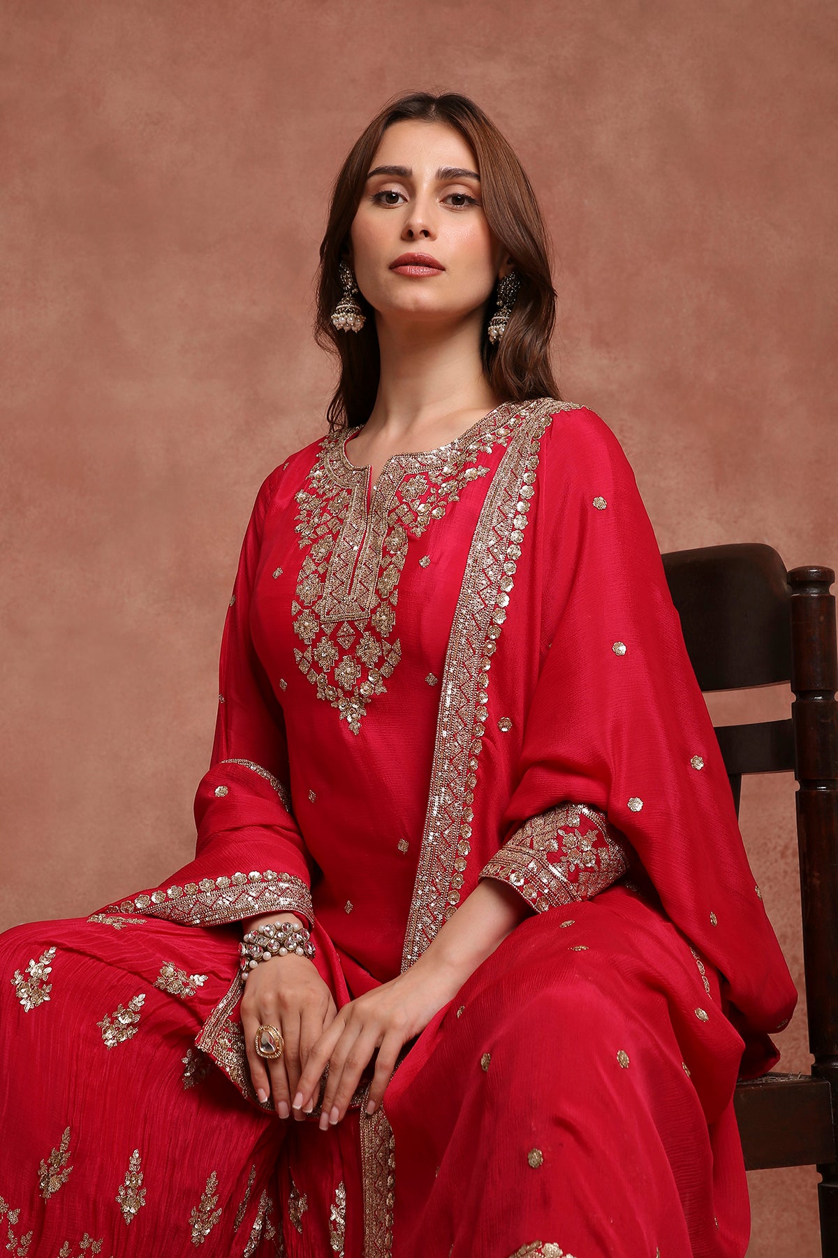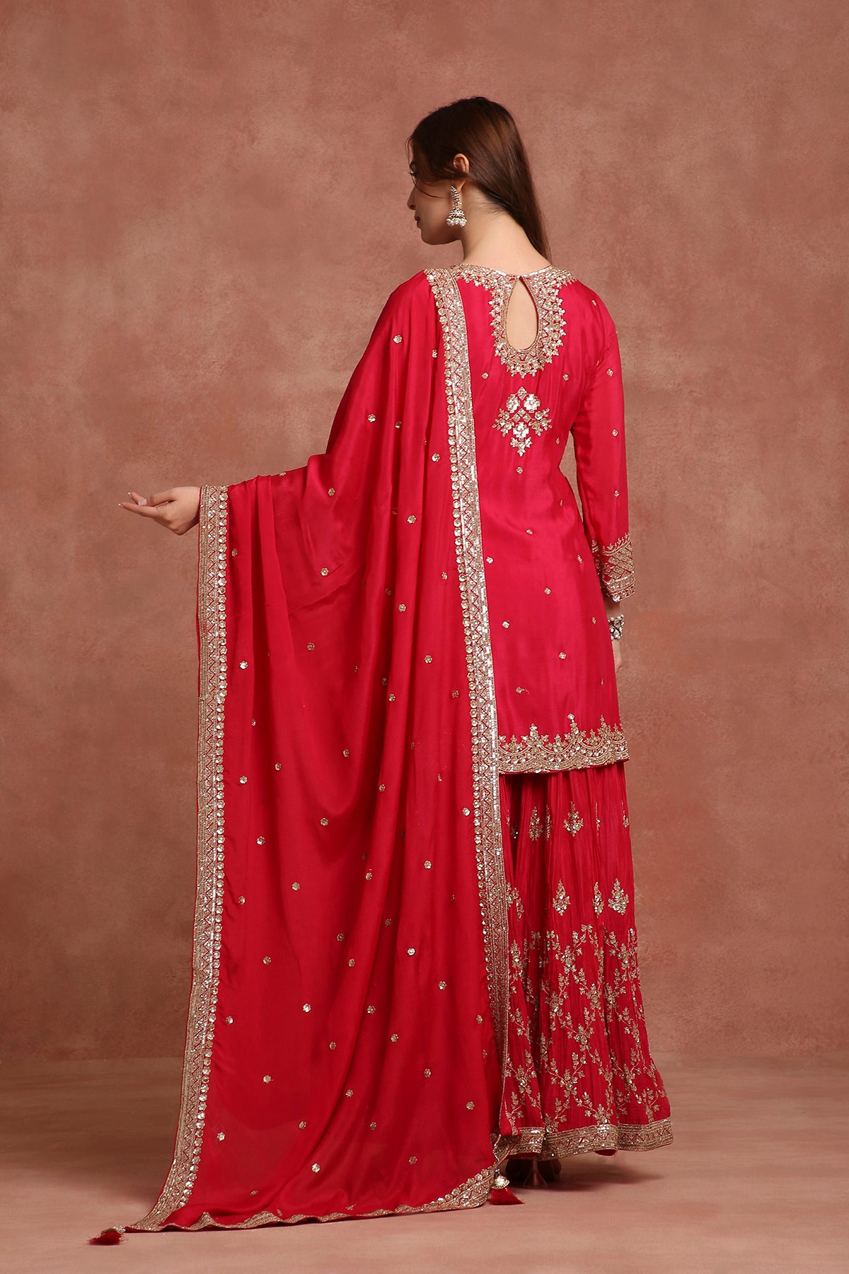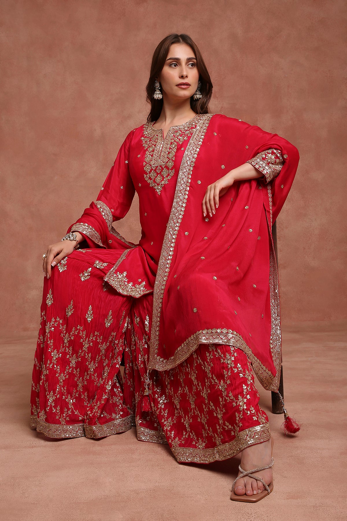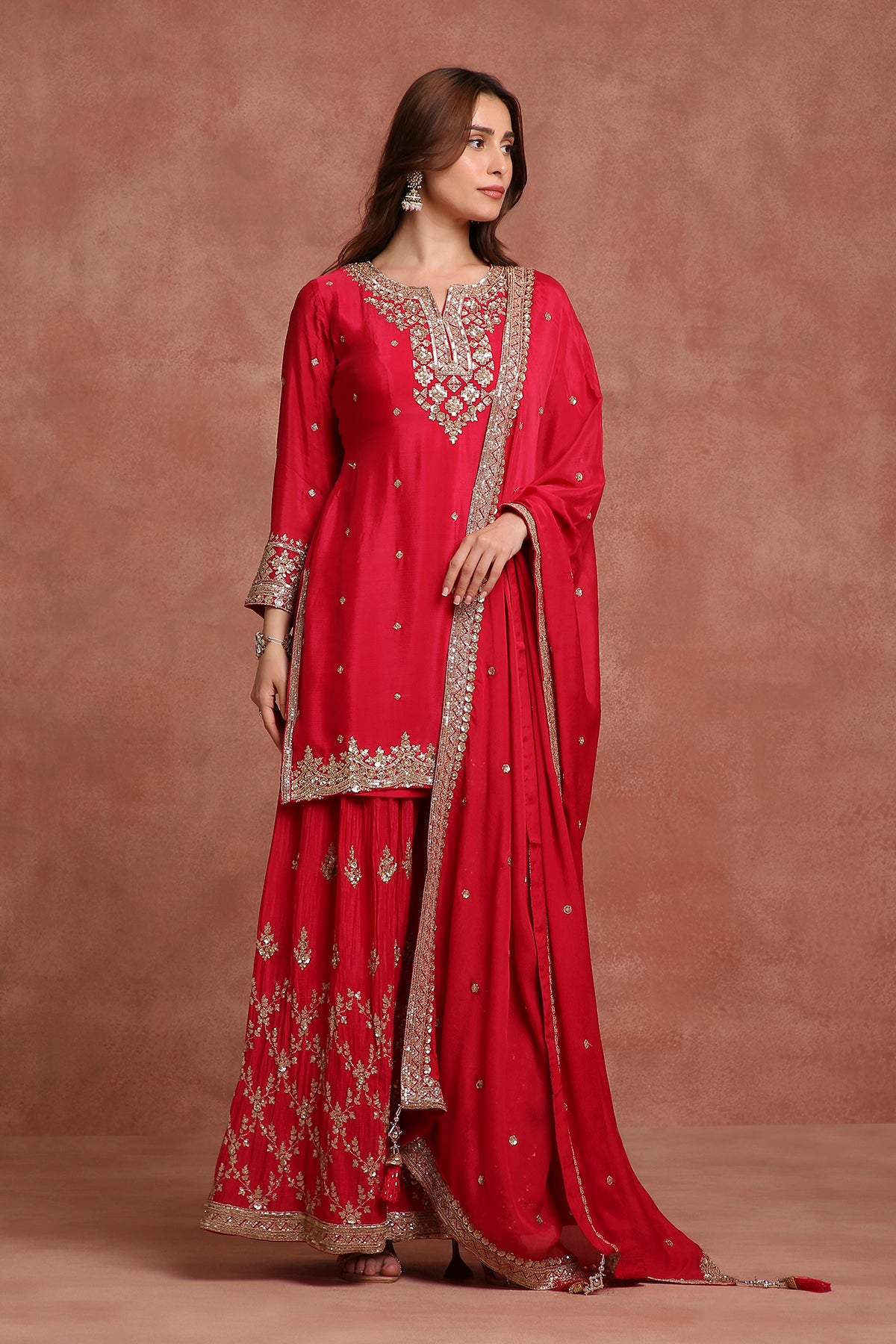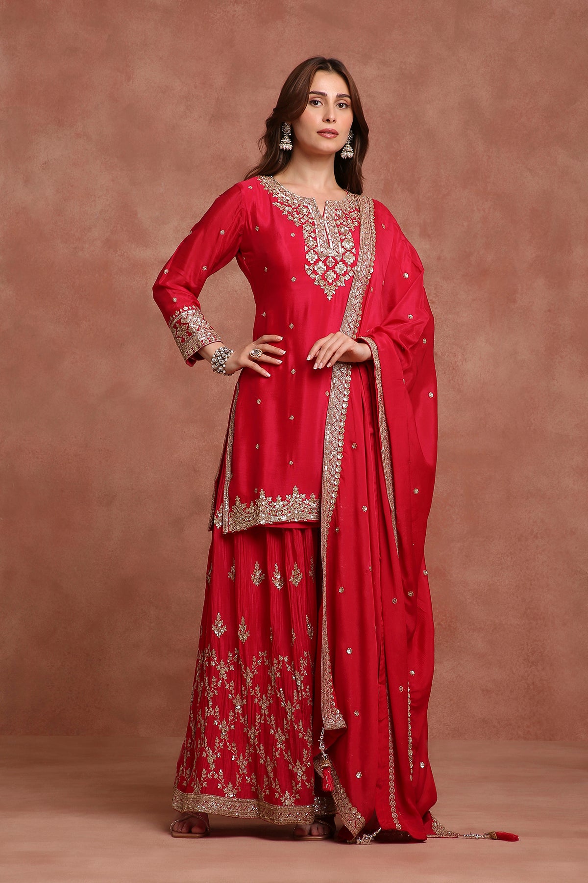 Turn heads in this vibrant red sharara suit set, a perfect blend of festive sparkle and timeless tradition. Crafted with intricate craftsmanship and fine detailing, this ensemble is ideal for weddings, festivals, and celebratory evenings.