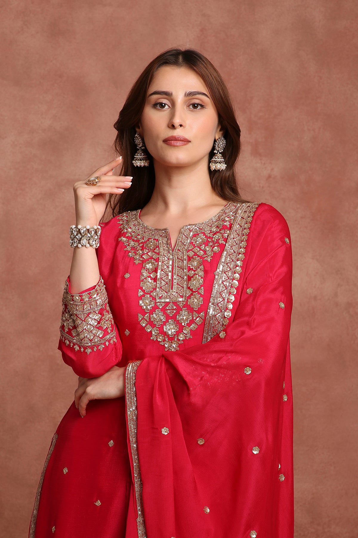 The dupatta in soft georgette or net completes the look with an embroidered border and subtle butis, adding layers of elegance and movement.
